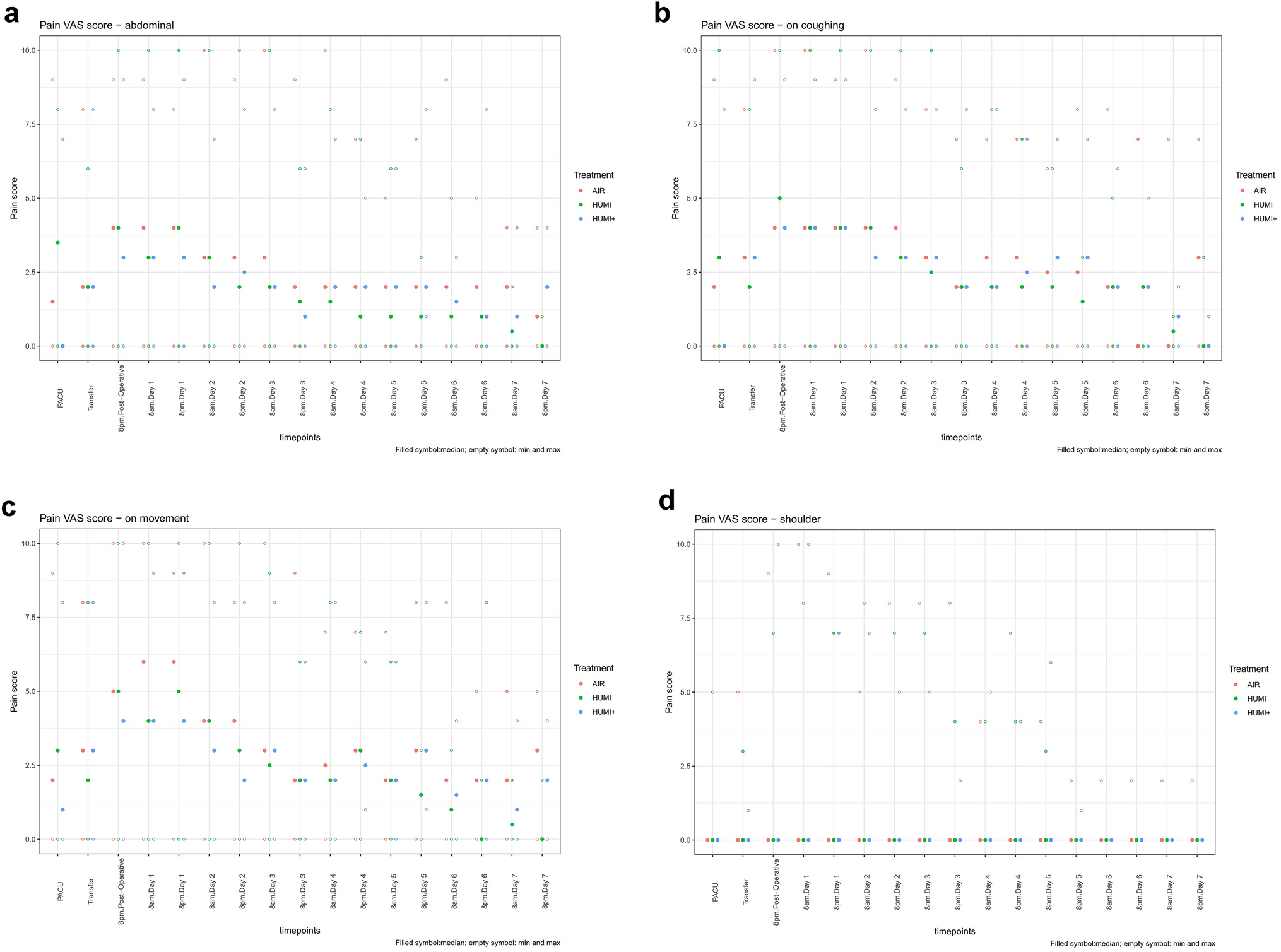 Since the study was designed to address heating capabilities and pain reduction, three groups were constructed, although for the research question, if humidified and warm insufflation gas reduces postoperative pain, a two-sided model would have been sufficient. In our analysis, we remained in the group “HUMI”/ “AIR” and “HUMI +”/ “AIR” design; one model was calculated with both groups pooled against group “AIR” without changing significance levels and under consideration of statistical balancing. Because we did not see any differences, we remained in the three-group model to follow the investigation plan properly.
