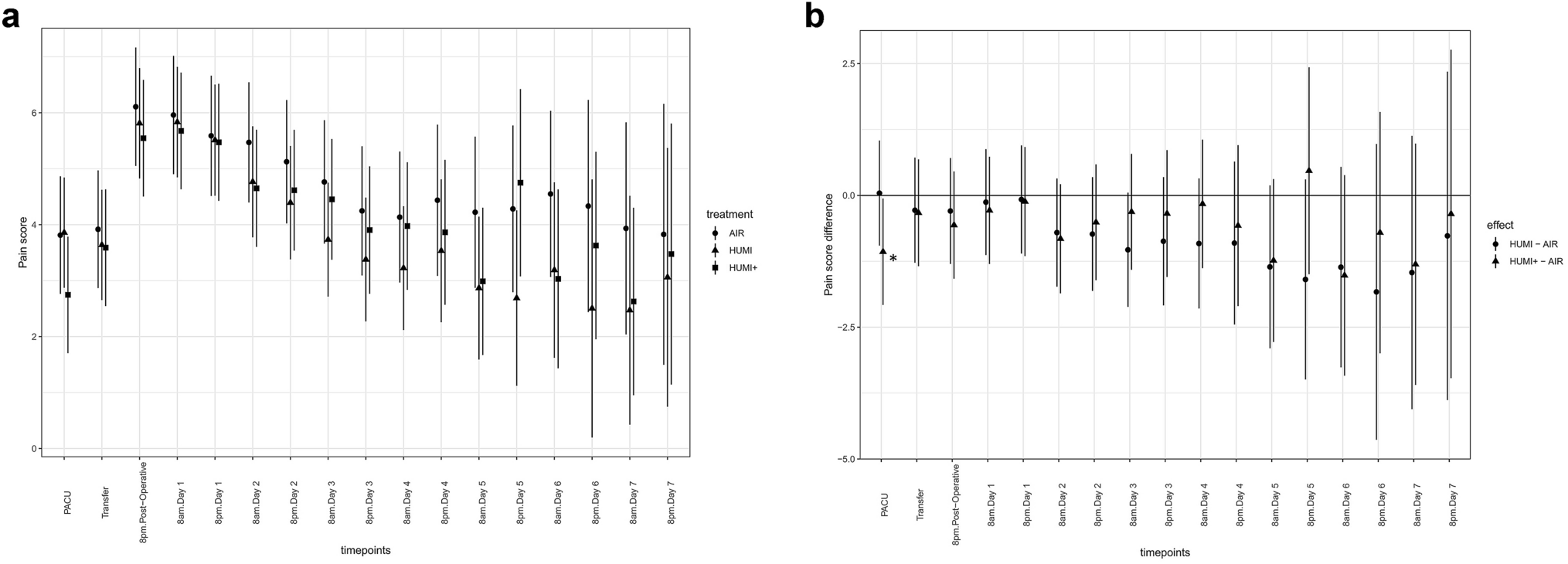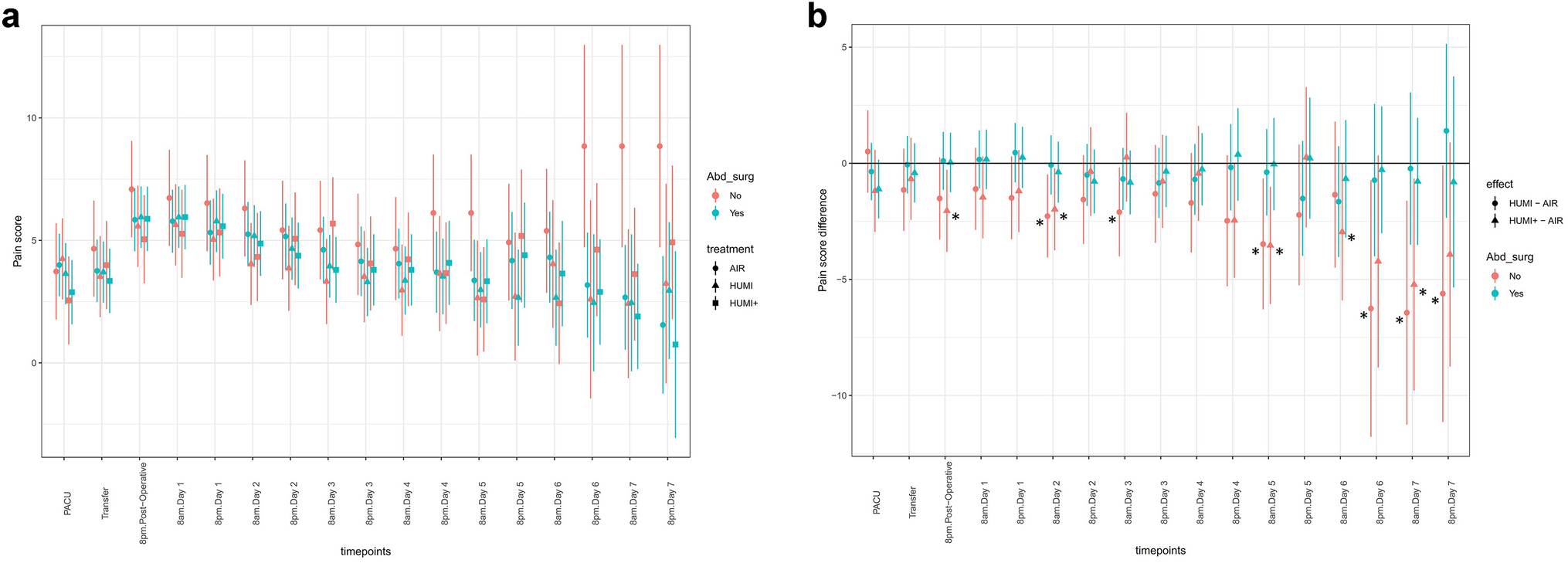 A Maximum pain scores of the three intervention groups with stratification by previous abdominal surgery. “AIR” = dot. “HUMI” = triangle. “HUMI +” = square. B Estimated treatment effect on pain score with stratification by previous abdominal surgery. Significant less pain score in subjects, without previous abdominal surgery (Asterisk). “HUMI” vs “AIR” = dot. “HUMI +” vs “AIR” = triangle