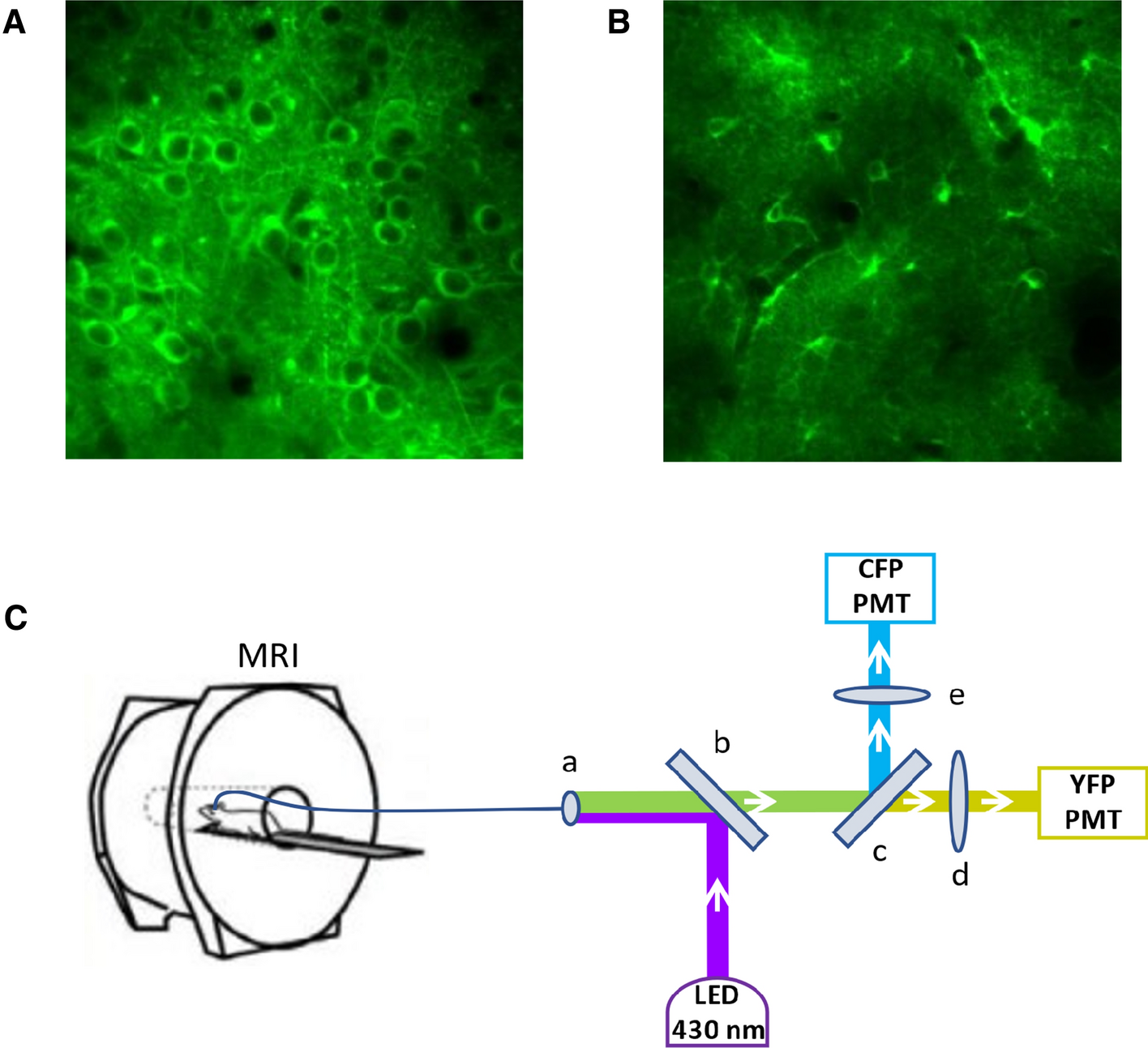 A 2PLSM image of neuronal expression of FLIIP, B 2PLSM image of astrocytic expression of FLIIP, C Experimental setup of simultaneous DGE MRI (7 T Bruker BioSpec 70/30) and fiber photometry measurements: (a) optic fiber connector, (b) dichroic mirror 455 nm, (c) dichroic mirror 515 nm, (d) bandpass filter 530/43 nm, (e) bandpass filter 475/42 nm