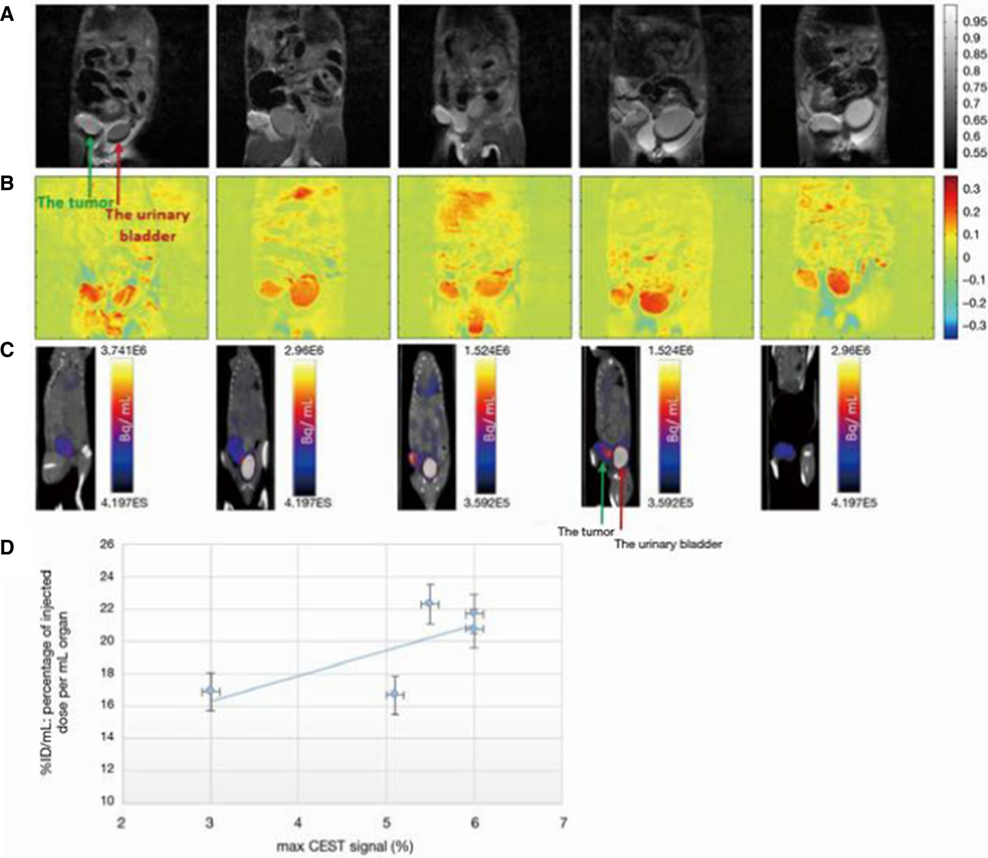 3OMG-based DGE MRI and 18F-FDG-PET/CT images from five tumors of a murine model (4T1 cells). A A coronal view of an anatomical T2-weighted MR images (7 T field) before 3OMG administration showing the tumor (green arrow) and the urinary bladder (red arrow). B % CEST images 60 min after per os administration with 3OMG, 1.0 g/kg (at a frequency offset of 1.2 ppm, B1 = 2.4 µT). A significant CEST contrast was obtained in the tumor and the urinary bladder as well as areas suspected to be metastases. C18F-FDG-PET/CT coronal view obtained 60 min after IV injection of 18FDG showing accumulation mainly in the tumor (green arrow) and urinary bladder (red arrow). D Correlation between 3OMG % CEST contrast and % ID/mL value in the five tumors from a murine model ± S.D [44]. From [44], with permission