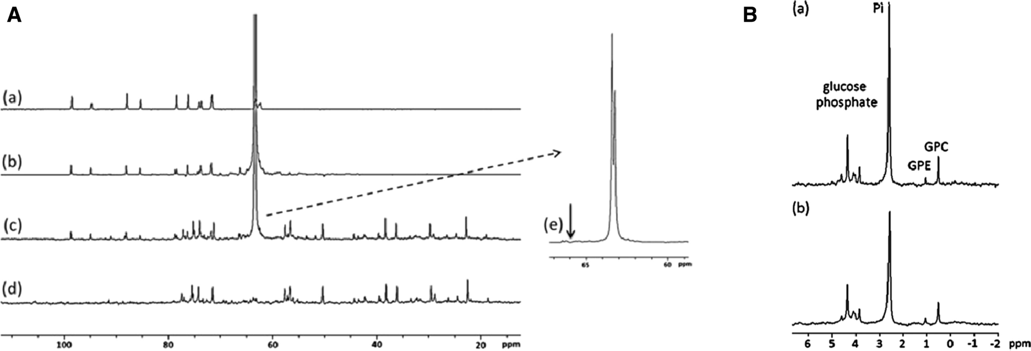 A1H‐decoupled 13C NMR spectra of 100 mM 3OMG solution (a), 100 mM [6‐13C]‐3OMG solution (b), combined extracts from 4T1 tumors treated with [6‐13C]‐3OMG (1 g/kg) (c), combined untreated extracts from 4T1 tumors (d), enlargement of (c and e). The arrow represents the expected position of the phosphorylated product of 3OMG (3OMG‐6‐phosphate) on the basis of the observed glucose‐6‐phosphate at 65.6 ppm and the 2‐DG‐6‐phosphate peak at 66.0 ppm. B1H‐decoupled 31P NMR spectra of combined extracts from 4T1 tumors treated with [6‐13C]‐3OMG (1 g/kg) (a), combined untreated extracts from 4T1 tumors (b). GPC‐glycerophosphocholine, GPE‐glycerophosphoethanolamine, Pi‐inorganic phosphate; spectra were calibrated according to GPC (0.49 ppm). From [46], with permission