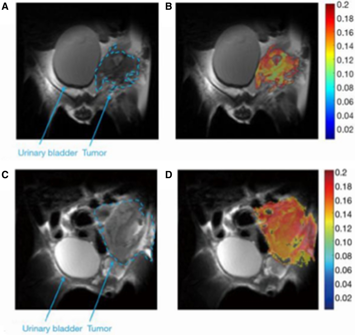 In vivo 2OMG and 6DG CEST MRI measurements in 4T1 tumors (7 T field). A, C T2-RARE anatomical images before administration of the agents. B, D MTRasym images at 1.0 and 1.2 ppm following treatment with 2OMG (3 g/kg, IP) and 6DG (2.0 g/kg, IP), respectively, overlaid onto the T2 anatomical image. From [44], with permission