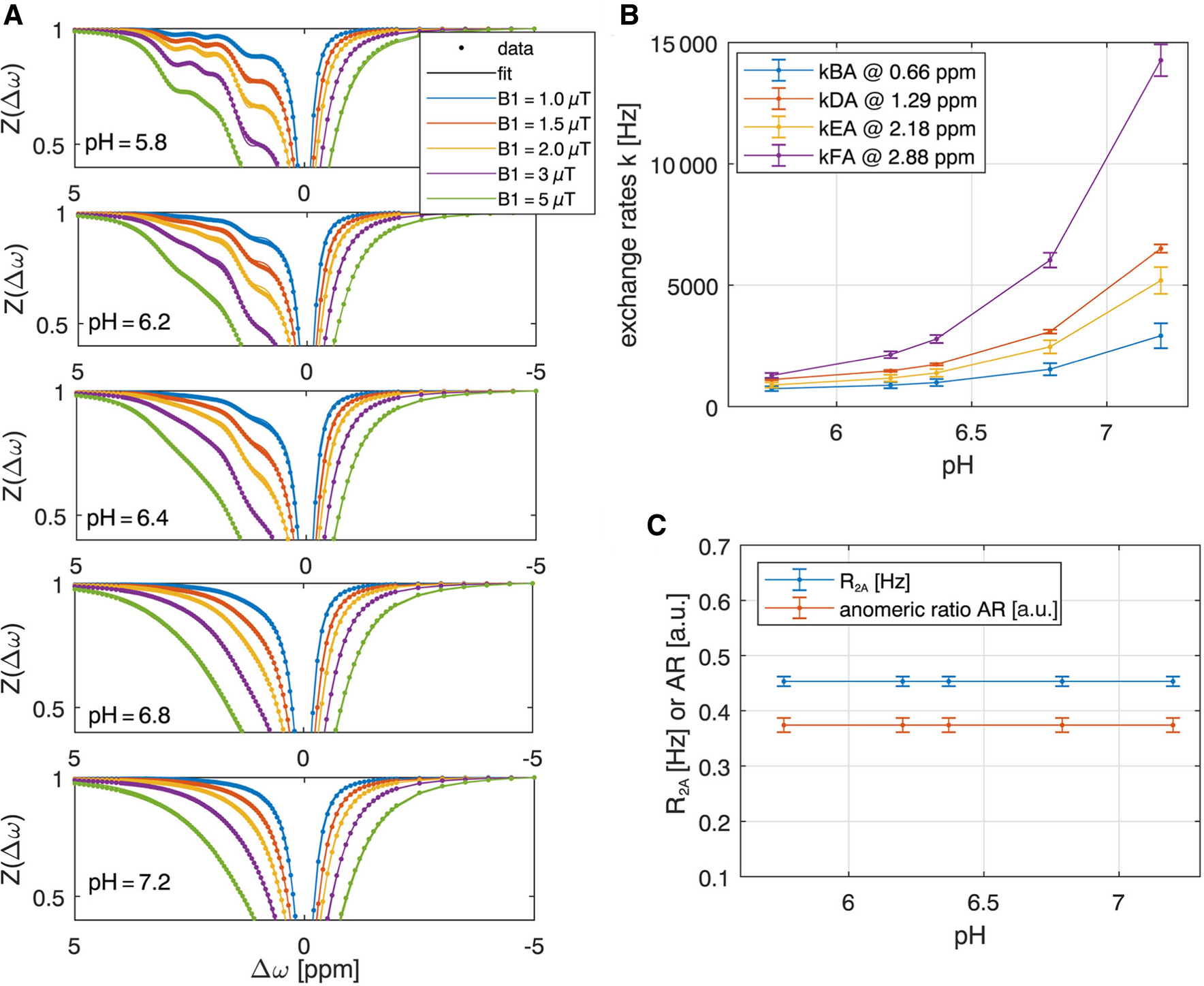 The CEST contrast depends on the proton exchange rate of the labile protons with water. However, since proton exchange rates in biological systems depend on many physiological parameters, translation to a clinical setting is challenging. CEST contrast is often affected by the acidity of the detected environment, the type and concentration of buffer solution, etc. An example of the acute effects caused by the change in buffer concentrations is shown in Fig. 4. The drastic changes in the MTRasym plot around the resonance frequency of the hydroxyl peaks due to the buffer change may indicate the difficulty in characterizing the source of the effect. Therefore, in most cases, it should be considered that the CEST contrast represents a contribution from multiple sources [44].