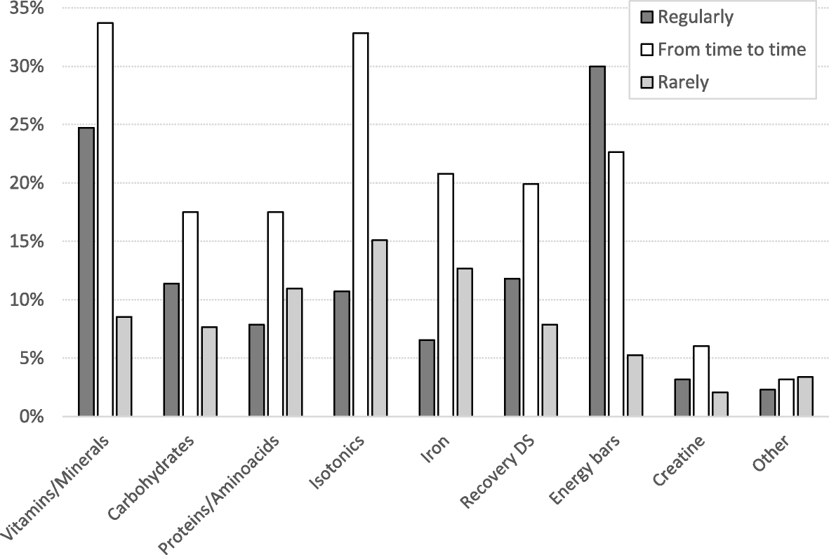 The consumption of specific DSs in team-sport players is presented in Fig. 1. Briefly, vitamins/minerals were most commonly used (67% players used them at least “rarely”), followed by isotonics (59%), energy bars (58%), iron (40%), recovery supplements (40%), carbohydrates (37%), proteins/amino acids (36%), creatine (11%), and other supplements (i.e., ginseng, Tribestan, omega-3, echinacea; 9%).