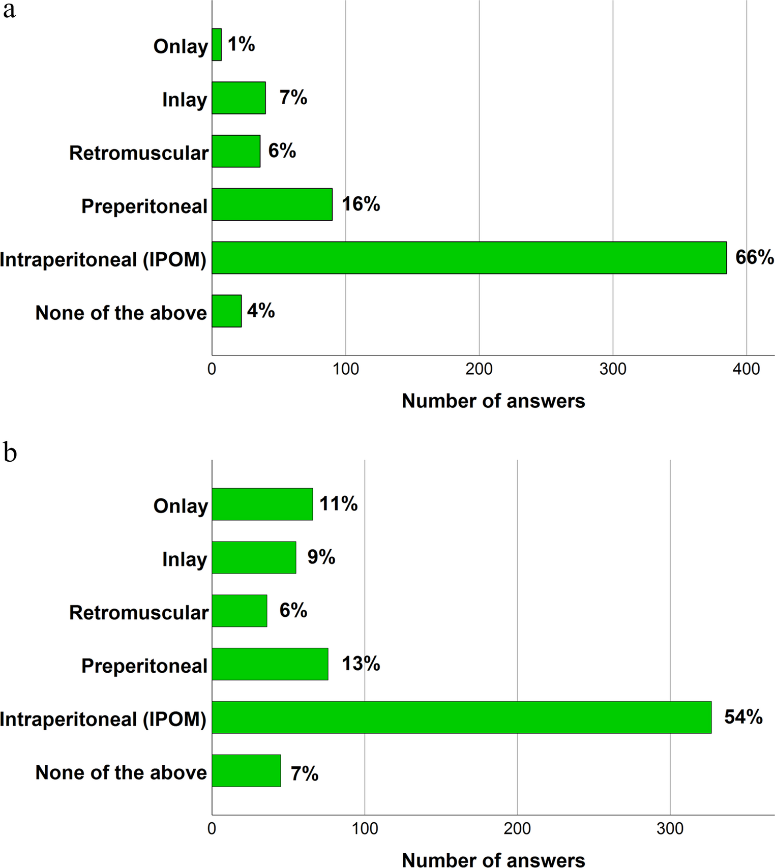 Surgeons’ beliefs of the mesh placement least likely to result in complications varied by hernia defect width (Table 3). For defects < 1 cm, the surgeons most frequently believed that preperitoneal placement carried the lowest overall risk (35–45%), followed by retromuscular (17–29%) and IPOM (12–27%). However, for recurrence and chronic pain specifically, onlay was believed by many surgeons to be more favorable than both retromuscular and IPOM. For defects ≥ 1 to ≤ 4 cm, retromuscular placement was most commonly believed to be the safest option (36–42%), followed by preperitoneal (29–40%) and IPOM (13–24%). In larger hernia defects (> 4 to 9 cm), retromuscular placement was clearly favored, with 50–75% of surgeons believing the mesh plane to be associated with the lowest complication risk, while preperitoneal was selected by 11–28% of surgeons. Across all hernia defect widths and complication categories, inlay placement was consistently considered the least favorable, with very few surgeons believing it to carry the lowest risk. Two out of three surgeons considered IPOM as a clinical concern for bowel adhesion and obstruction (Fig. 2a), while preperitoneal placement was also considered to carry a risk, though by much fewer surgeons. Additionally, more than half of surgeons considered IPOM a clinical concern for fistula formation (Fig. 2b). Surgeons’ beliefs of which repair technique would yield the best overall outcome also varied by hernia defect width (Table 4). For defects < 1 cm, the most commonly selected placements were preperitoneal repair and suture-only repair without mesh, followed by onlay repair. For defects ≥ 1 to ≤ 4 cm, preperitoneal and retromuscular repairs were equally believed to have the best outcome, followed by IPOM. For larger defects measuring > 4 to 9 cm, retromuscular repair was overwhelmingly favored, with 68% of surgeons believing this placement to be the best.