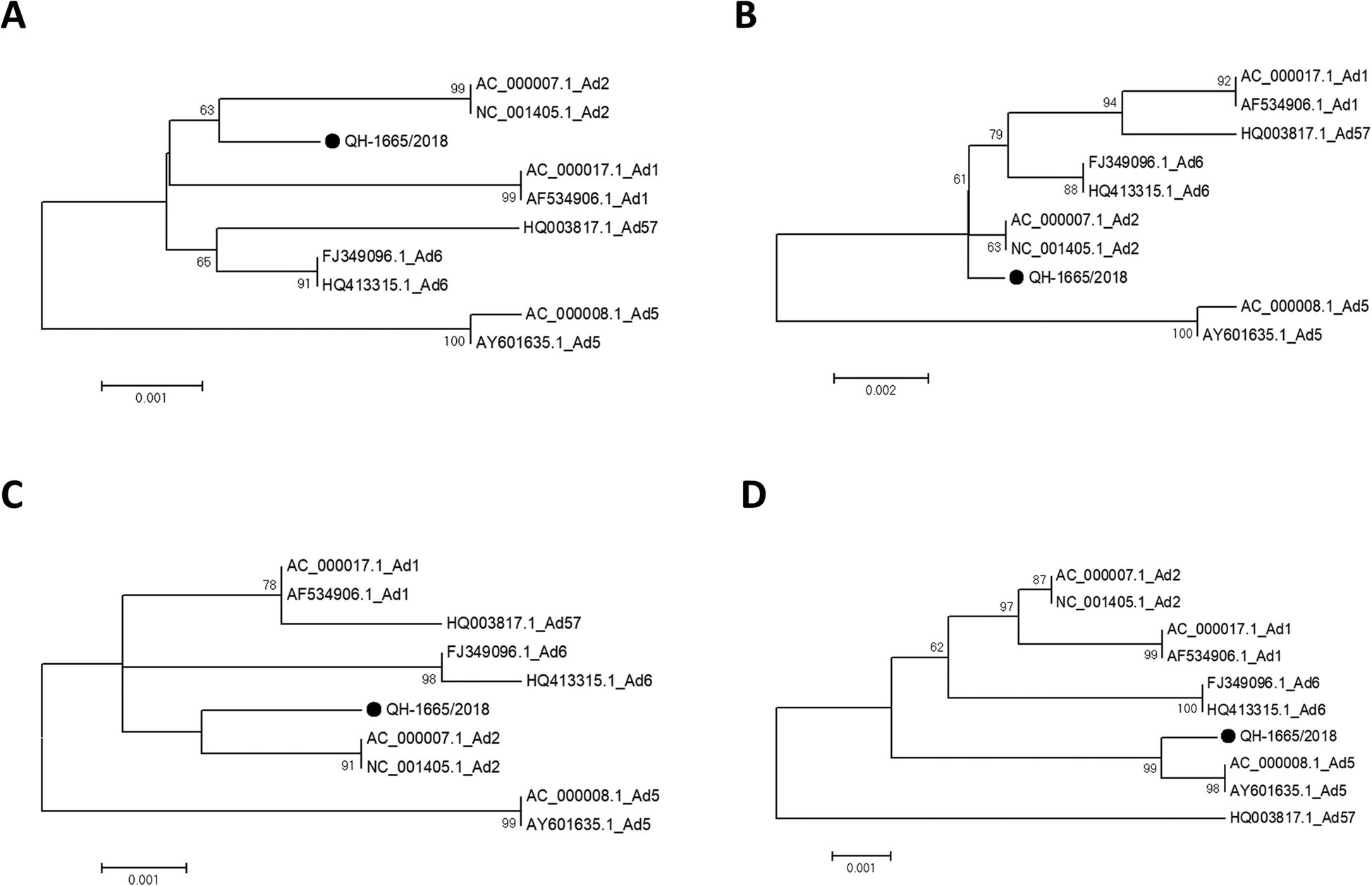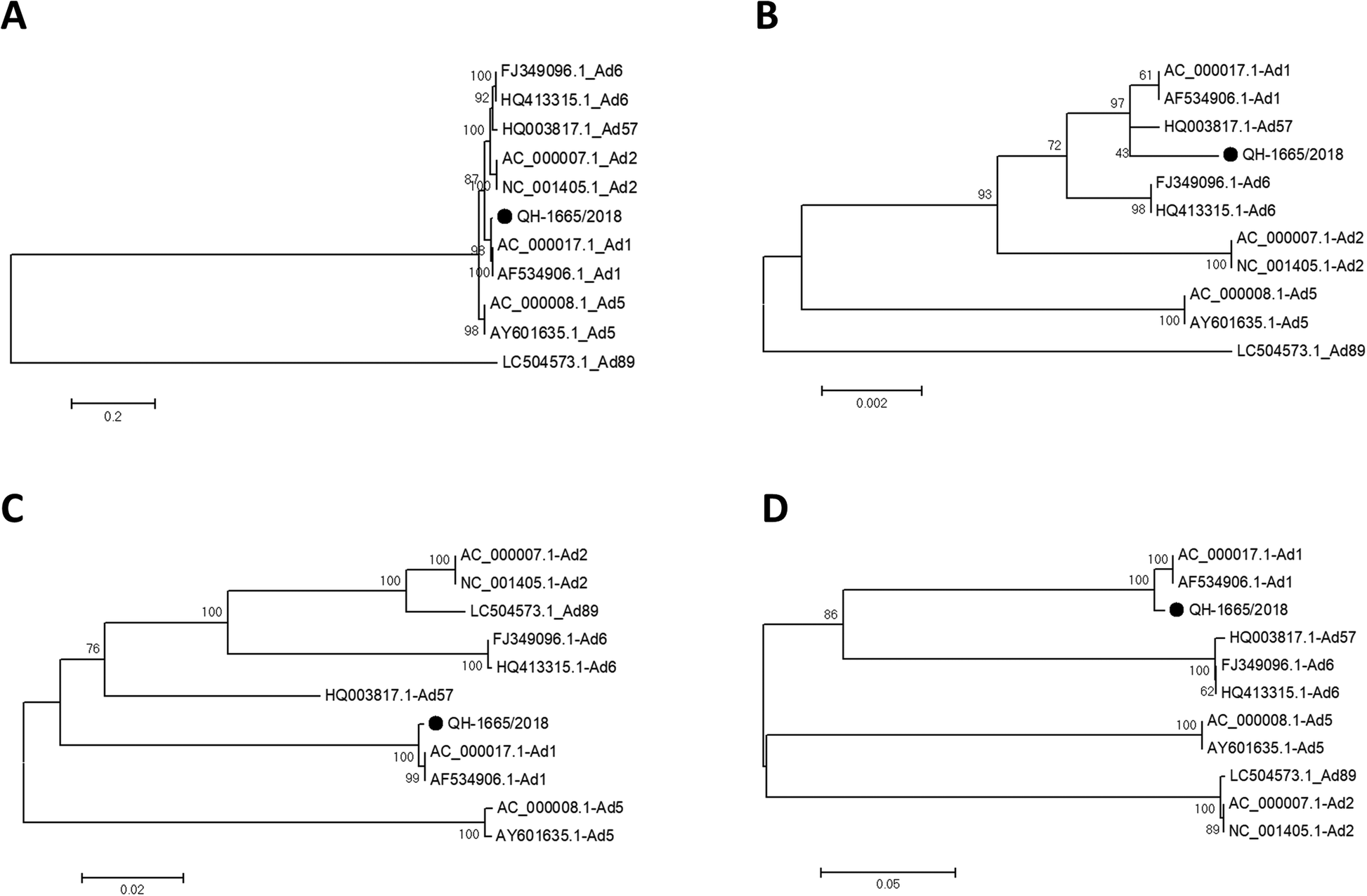 8]. However, until now, little data on HAdV recombination have been reported in Qinghai Province. Here, we describe the characterization of an HAdV-1 recombinant (QH-1665/2018) isolated from an infant aged one month with influenza-like illness in Qinghai Province in 2018. This information would enhance the understanding of recombination of HAdV-C, and might assist with effective prevention and control of respiratory adenovirus infection in Qinghai Province.