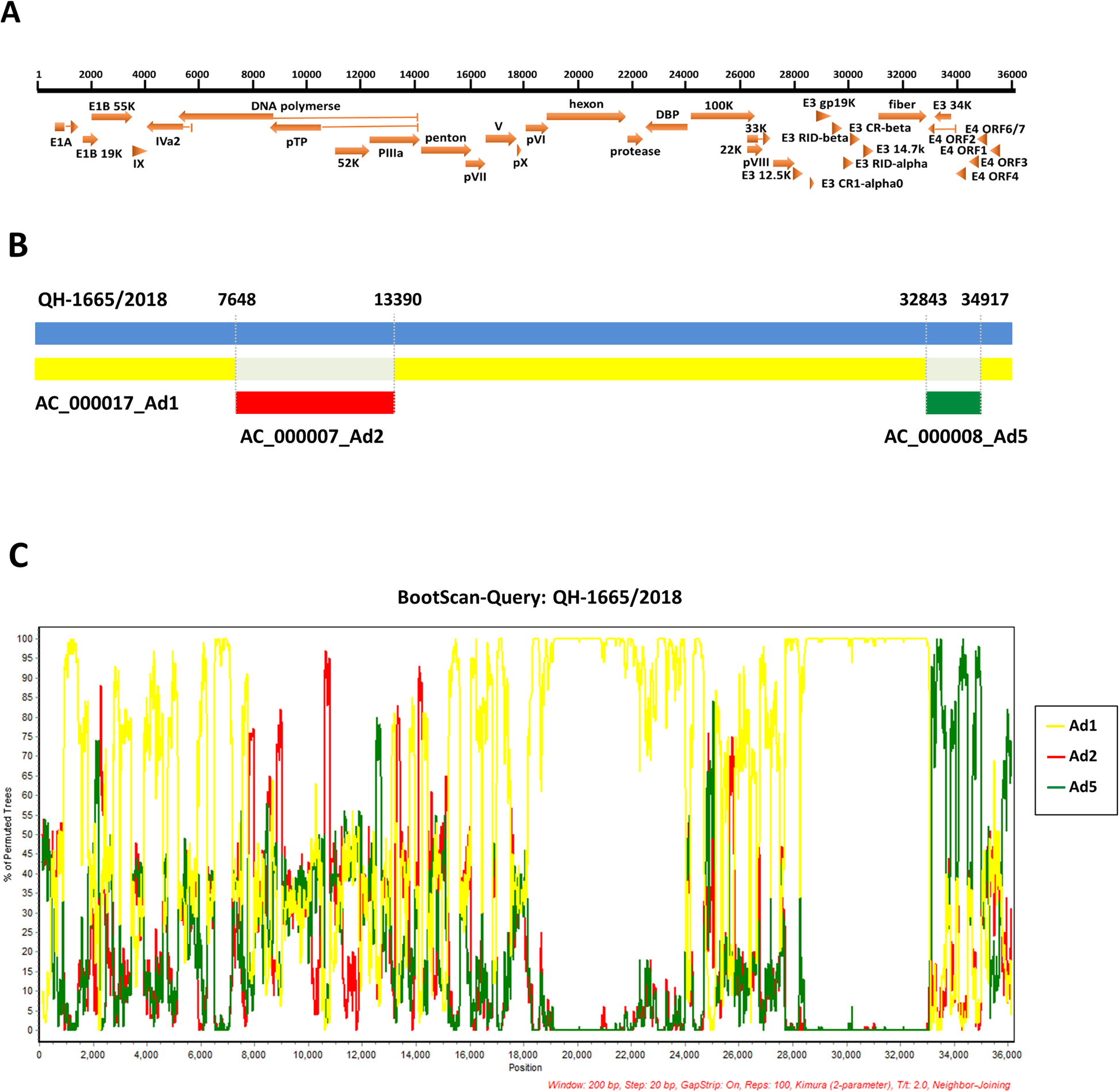 In this study, through phylogenetic analysis of HAdV based on the complete genome and 3 major antigen genes (penton, hexon and fiber), QH-1665/2018 was clustered to HAdV-1 [P1H1F1], which could be considered the backbone of the prototype HAdV-1 genome. The comparative genome analysis between QH-1665/2018 and other HAdV-C strains displayed several genes that did not show the highest sequence similarity with HAdV-1, for example, 52 K showed the highest sequence similarity with HAdV-2 and E4 showed the highest sequence similarity with HAdV-5, which indicated QH-1665/2018 might be a recombinant. In addition, recombination analysis based on the RDP4 package and SimPlot software both showed that QH-1665/2018 had recombinant events involving HAdV-1, HAdV-2 and HAdV-5, which was re-confirmed by phylogenetic analysis. The recombination areas were located between 7648 and 13,390, which included pTP, 52 k and partially pIIIa, and between 32,843 and 34,917, which included most of E4. Interestingly, the recombination event occurred at pTP, 52 k, pIIIa and E4 of HAdV-1, but not in known recombination hotspots, such as the penton base, hexon, and fiber [