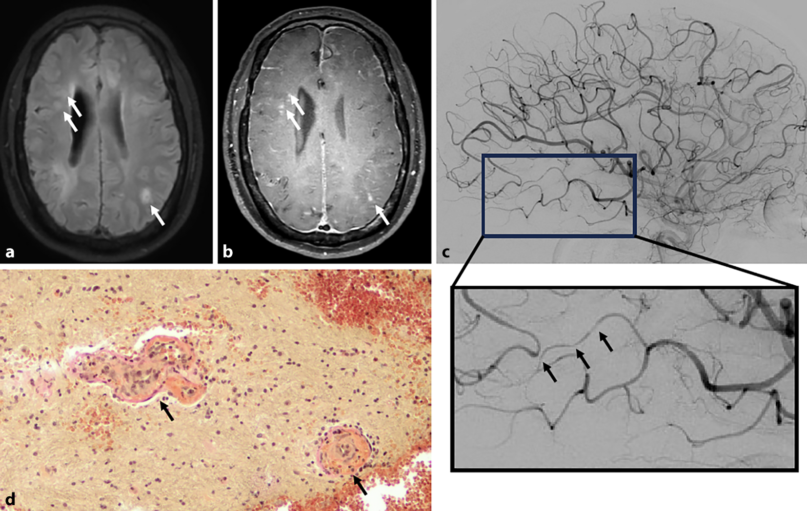 Charakteristische Befunde bei Patienten mit primärer Angiitis des zentralen Nervensystems (PACNS). a Magnetresonanztomographie (MRT) mit FLAIR(„fluid attenuated inversion recovery“)-Sequenz, die multiple demyelinisierende Läsionen aufzeigt. b MRT unter Verwendung von Black-blood-Sequenzen, welche einerseits eine teilweise deutliche Kontrastmittelaufnahme der Läsionen demonstrieren (Pfeile) und andererseits eine ausgeprägte Kontrastmittelanreicherung der Pachy- und Leptomeningen zeigen, als Indikator der floriden Entzündung. c Digitale Subtraktionsangiographie (DSA), die multiple Kaliberschwankungen aufweist, exemplarisch im vergrößerten Bildausschnitt durch Pfeile markiert. d Elastica-van-Gieson(EvG)-Färbung eines Biopsats mit durch Pfeile gekennzeichneten Blutgefäßen, die Gefäßwandnekrose und einzelne Lymphozyten in der Gefäßwand zeigen (Vergr.: 200-fach)