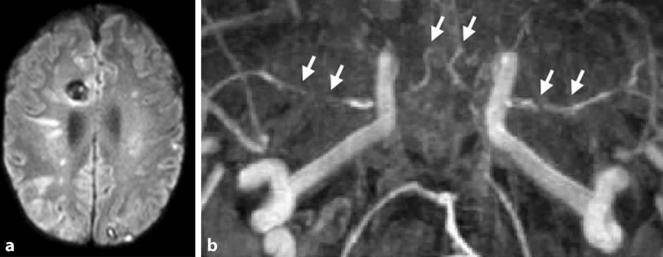 Etwa 20 % der PatientInnen mit bakterieller Meningitis erleiden innerhalb der ersten Wochen nach der Diagnosestellung einen ischämischen Schlaganfall [36]. Neben der bakteriellen Meningitis gehören zu den erregerbedingten Meningitiden auch solche, die durch Viren, Mykobakterien, Pilze oder Protozoen verursacht werden. Infolge der Entzündungsreaktion können bei nahezu allen Formen der Meningitiden sekundär Schlaganfälle auftreten. Die bakterielle Meningitis kann durch das Auftreten typischer klinischer Symptome (Kopfschmerzen, Fieber über 38 °C, Nackensteifigkeit oder Bewusstseinsstörungen) und die Anzahl der Leukozyten im Liquor (über 1000/μl) und/oder den Nachweis bakterieller Mikroorganismen im Liquor diagnostiziert werden [37]. Zerebrovaskuläre Komplikationen, die neben dem ischämischen Schlaganfall auch Hirnvenen- und Sinusthrombosen, Hirnblutungen sowie mykotische Aneurysmen umfassen, tragen zu einem schlechten Outcome der bakteriellen Meningitis bei. Hinsichtlich der zeitlichen Charakteristik kann ein zweigipfeliger Verlauf mit frühen (Tag 3 und 7) und späten (Tag 14) Schlaganfällen beobachtet werden [36]. Der genaue pathophysiologische Mechanismus zur Entstehung von Schlaganfällen im Kontext der bakteriellen Meningitis ist noch nicht vollständig verstanden, jedoch werden der Nachweis von zerebralem Vasospasmus, Vaskulitis, Gerinnungsstörungen, infektiöser Endokarditis und systemischer Entzündungsreaktionen diskutiert [38]. Inwiefern sich die Entstehungsmechanismen früher und später zerebraler Ischämien unterscheiden, ist zum aktuellen Zeitpunkt ungeklärt. Schlaganfälle infolge einer bakteriellen Meningitis treten häufig disseminiert in beiden Hemisphären lokalisiert auf (Abb. 2a). Interessanterweise konnte in einer Fallserie gezeigt werden, dass die Schlaganfälle vor allem in den Versorgungsgebieten von Arterien auftreten, die sich in der Nähe des Infektionsfokus, wie z. B. einer Mastoiditis, befinden [36]. Das Risiko eines ischämischen Schlaganfalls ist unabhängig vom identifizierten Erreger [36]. Eine Vaskulopathie infolge einer bakteriellen Meningitis lässt sich am sensitivsten anhand multipler intraduraler Gefäßverengungen in der Angiographie nachweisen (Abb. 2b).