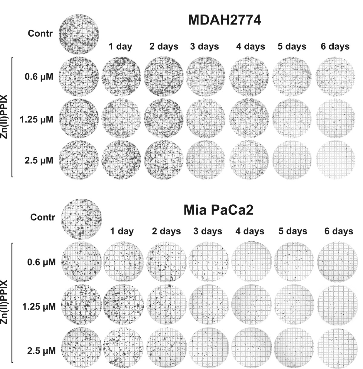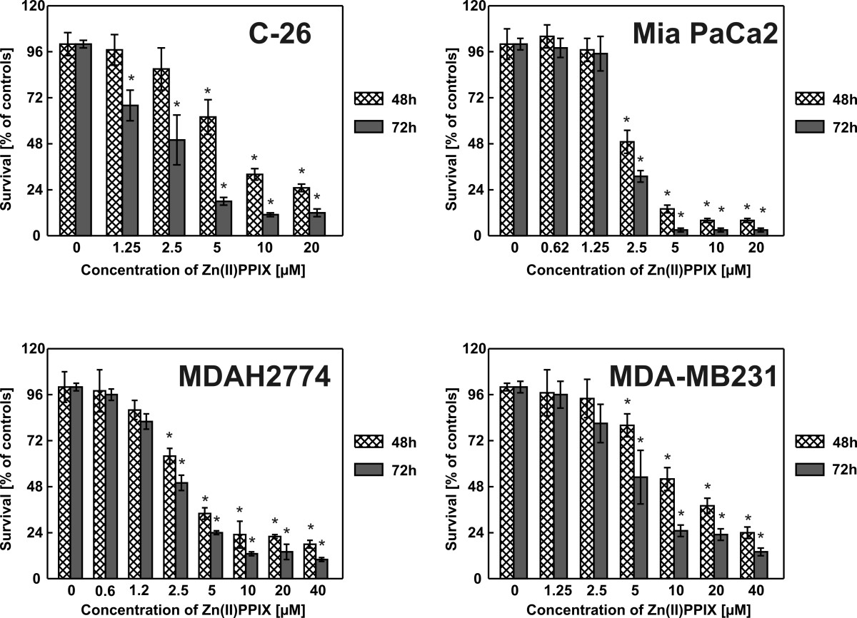 MDAH2774 or Mia PaCa2 cells were plated at 2.5 × 105 cells per 35-mm dish (Sarstedt). Four hours after seeding, Zn(II)PPIX was added at indicated concentrations. After 24 hours of incubation in dark, the cells were washed with PBS, trypsinized and seeded into 35-well plates in triplets at the concentration of 1 × 103 cells per a dish. Fresh medium containing Zn(II)PPIX was added. The medium was removed daily for the 6 following days. After 14 day incubation in the dark, the cells were rinsed with PBS, fixed for 10 min in pure methanol and stained with 0.5% crystal violet in 2% ethanol for 10 min at room temperature. Then the plates were washed four times with tap water and air-dried. The images of the plates were made using the Olympus Camedia C750 Ultra Zoom digital camera.