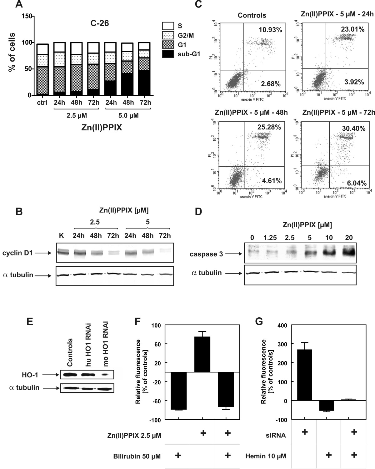 For Western blotting C-26 were treated with Zn(II)PPIX for 24, 48 or 72 h. After indicated times of culture cells were washed with PBS and lysed with radioimmunoprecipitation assay buffer (RIPA) containing Tris base 50 mM, NaCl 150 mM, NP-40 1%, sodium deoxycholate 0.25% and EDTA 1 mM supplemented with Complete® protease inhibitor cocktail tablets (Roche Diagnostics, Mannheim, Germany). Protein concentration was measured using Bio-Rad Protein Assay (BioRad, Hercules, CA, USA). Equal amounts of whole cell proteins were separated on 12% SDS-polyacrylamide gel, transferred onto Protran® nitrocellulose membranes (Schleicher and Schuell BioScience Inc., Keene, NH, USA), blocked with TBST [Tris buffered saline (pH 7.4) and 0.05% Tween 20] supplemented with 5% nonfat milk and 5% FBS. The following antibodies at 1:1000 dilution were used for the 24 h incubation: mouse monoclonal anti-α-tubulin (Promega Corporation, Madison, WI, USA), rabbit polyclonal anti-cleaved caspase 3 (Cell Signaling Technology, Beverly, MA, USA) and mouse monoclonal anti-cyclin D1 (Santa Cruz). After extensive washing with TBST, the membranes were incubated for 45 min with corresponding alkaline phosphatase-coupled secondary antibodies (from Jackson Immuno Research). The color reaction for alkaline phosphatase was developed using nitroblue tetrazolium and 5-bromo-4-chloro-3-indolyl phosphate (Sigma).