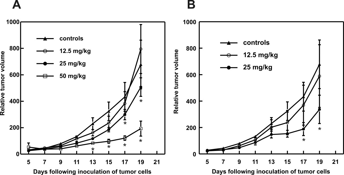 For assessment of antitumor activity of Zn(II)PPIX in vivo, exponentially growing C-26 were harvested, re-suspended in PBS medium to the appropriate concentration, and injected at the dose of 1 × 105 cells per mouse into the footpad of the right hind limb of experimental mice. Tumor cell viability measured by trypan blue exclusion was always above 95%. For in vivo treatment Zn(II)PPIX was dissolved in DMSO and further diluted in 0.9% NaCl to required concentrations. Final DMSO concentration was always less then 0.1%. Zn(II)PPIX was distributed intraperitoneally at doses from 12.5 to 50 mg per kg of body weight or orally at doses from 11 to 22 mg per kg of body weight. Control animals received 0.1% DMSO solution in 0.9% NaCl i.p. or orally.