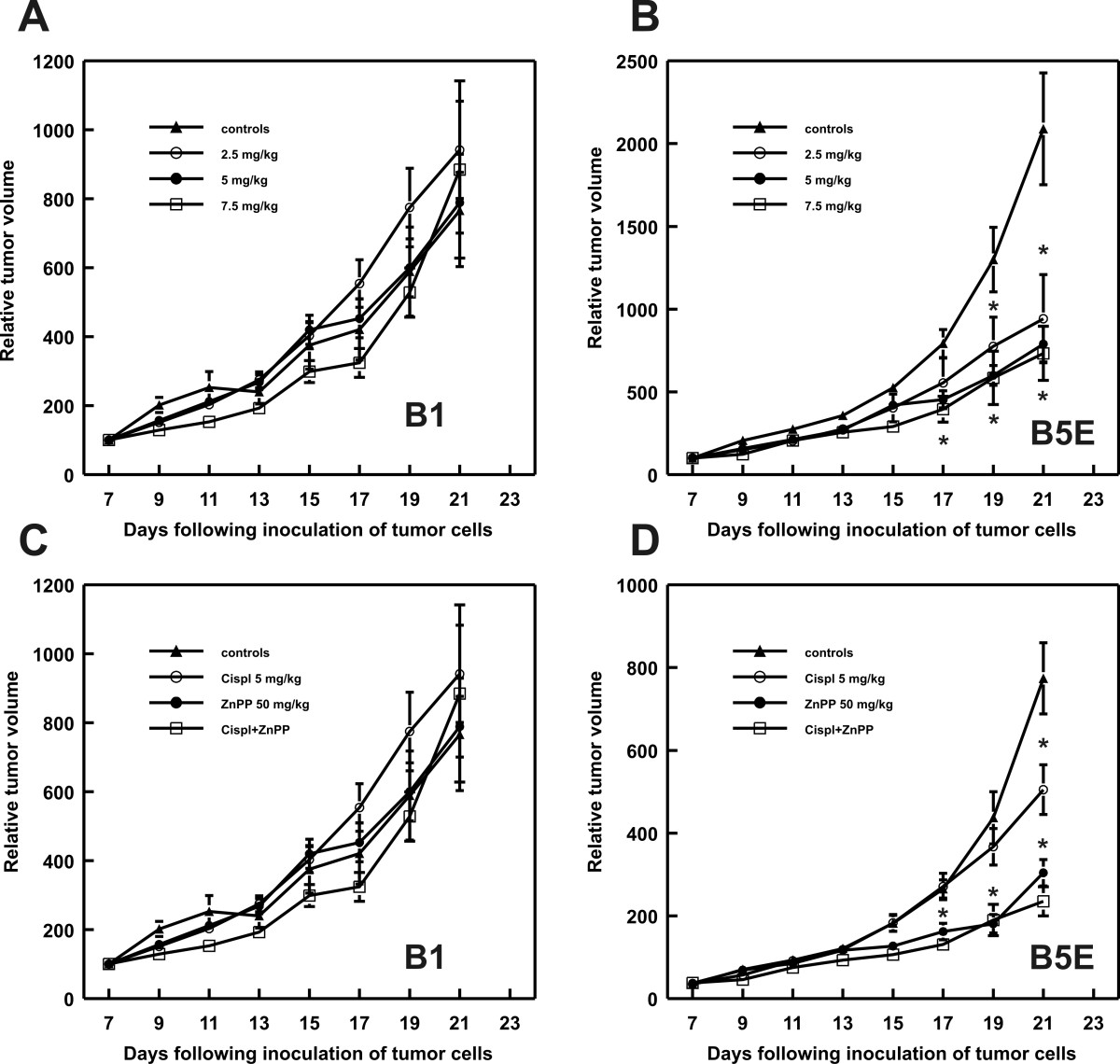 For in vivo experiments exponentially growing B1 and B5E cells were injected at a dose of 1 × 106 cells per mouse into the footpad of the right hind limb of experimental mice. Cisplatin was administered i.p. at a single dose of 7.5 mg/kg on the 7th day after inoculation of tumor cells. Zn(II)PPIX treatment (50 mg/kg i.p.) was started on the day 7 after inoculation of tumor cells and continued for 7 consecutive days. First dose of HO-1 inhibitor was administered 1 h before the chemotherapeutic.