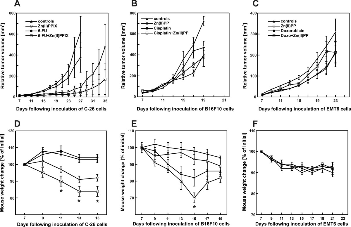 For in vivo experiments evaluating the effectiveness of combine treatment using Zn(II)PPIX and chemotherapeutics, exponentially growing C-26, EMT6 and B16F10 cells were injected at the dose of 1 × 105, 1 × 105 and 1 × 106 cells per mouse, respectively into the footpad of the right hind limb of experimental mice. Zn(II)PPIX treatment (50 mg/kg i.p.) was started on the day 7 after inoculation of tumor cells and continued for 7 consecutive days. First dose of HO-1 inhibitor was administered 1 h before each of the chemotherapeutics to eliminate any possible interactions (such as neutralization) between drugs. Cisplatin (Platidam, Pliva-Lachema, Cech Republic) at the dose of 7.5 mg/kg i.p., 5-FU (Fluorouracil 1000 Medac, Medac, Hamburg, Germany) – 50 mg/kg i.p., or doxorubicin (Adriblastina RD, Pharmacia Italia, Milan, Italy) – 7.5 mg/kg i.p. were administered at a single dose on the day 7th after inoculation of tumor cells.